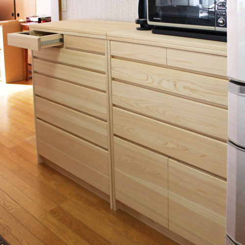 見える部分には檜を、引出し内部や裏板には吸湿効果の高い杉材を使用しました。