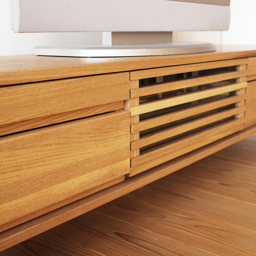 厳選された無垢のタモ材を使用。やさしいライトトーンの木肌と豊かな木目が、リビングに自然のあたたかさをもたらします。